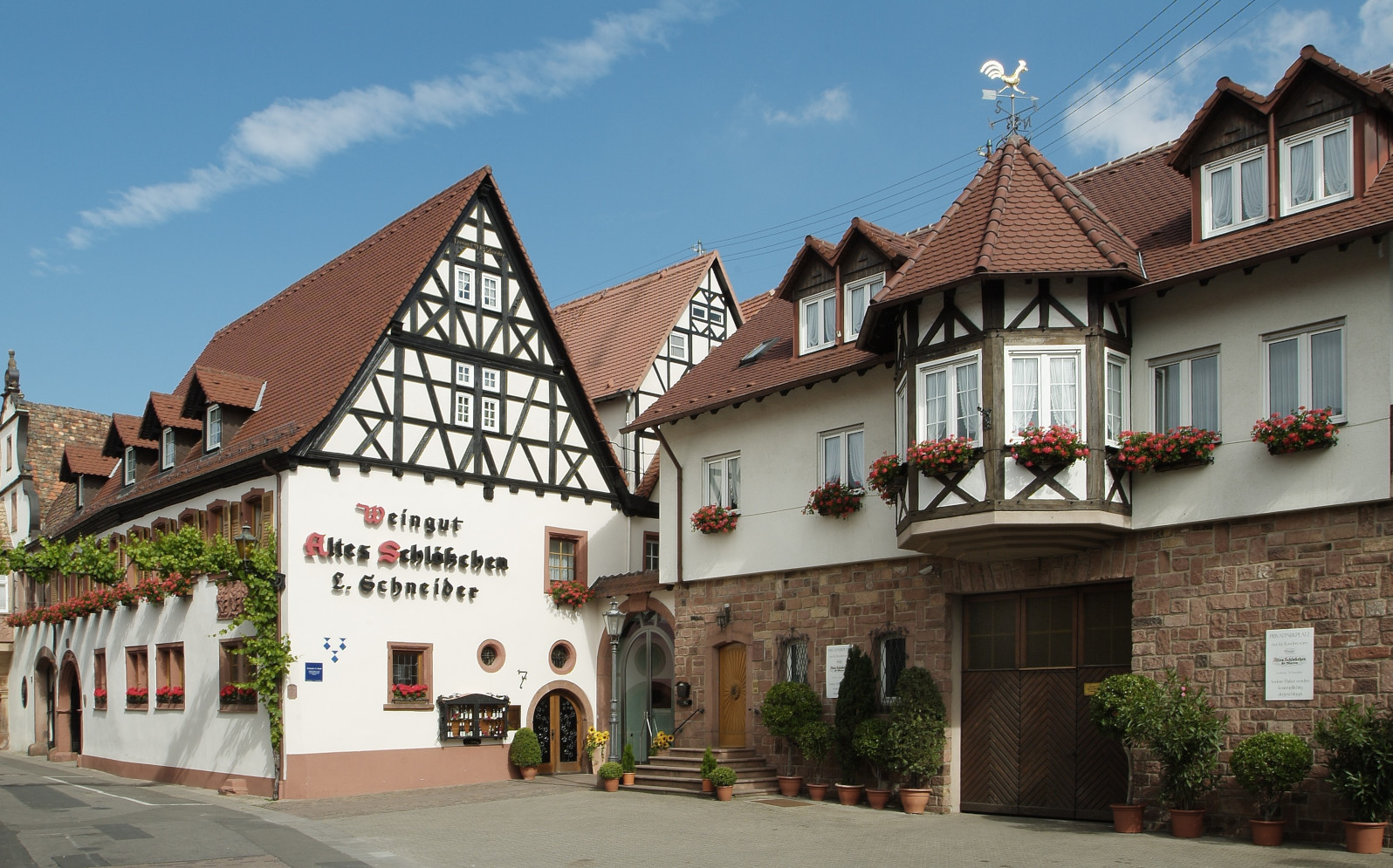 wurde auf dem ehemaligen Besitz des Klosters Eußerthal in den Jahren 1587-1604 von Johann Hund von Saulheim und Christina von Dienheim errichtet. Das denkmalgeschützte Fachwerkhaus ist Sitz unseres Weinguts „Ludwig Schneider“. Noch immer sind alte Teile des Fachwerkgebäudes vorhanden, wie z.B. der kleine Gewölbekeller aus dem 15. Jahrhundert, in welchem heute Gruppenweinproben abgehalten werden. Das Renaissance-Fachwerkgebäude mit Sandsteinportalen ist über die Jahrhunderte gut erhalten geblieben und eines der Anziehungspunkte im romantischen Weindorf St. Martin. In diesem Ambiente, welches historisches Fachwerk und moderne Vinothek vereint, sind alle Genießer herzlich eingeladen die Weine der Weinkellerei „Altes Schlößchen“ zu verkosten.